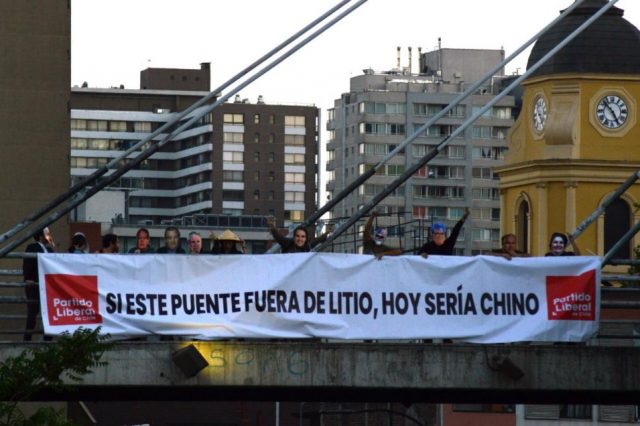 A eso de las 6 de la mañana de la jornada del lunes 26, militantes del Partido liberal manifestaban su posición crítica frente a la situación del litio y China. El grupo activistas colgó desde el Puente Santa Ana dos grandes lienzos: uno que era ilegible para la mayoría de los chilenos por sus símbolos Chinos, y el otro con su traducción en español “si este puente fuera litio, hoy sería chino”.