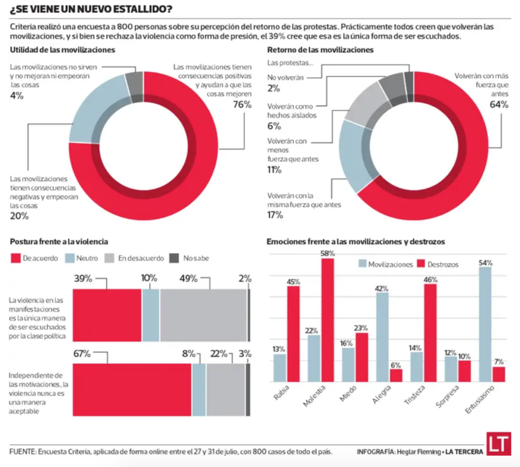 Esa figura describe lo que piensan muchos chilenos hoy, que es que las protestas resurgirán en los próximos meses. Y es lo que refleja la última encuesta Criteria, que midió la percepción de la población respecto de las movilizaciones, confirmando que la ciudadanía piensa que estas volverán.