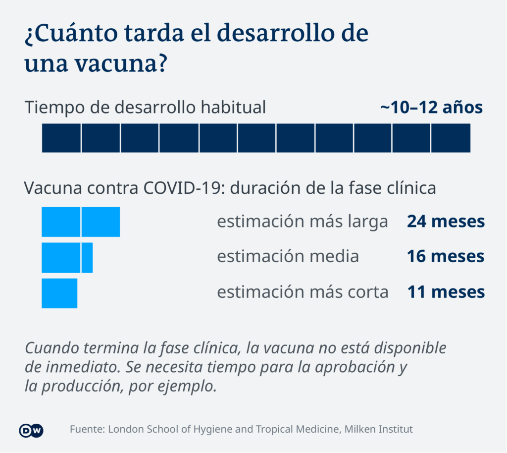 En promedio, el desarrollo de una vacuna lleva de 10 a 12 años. En el caso del COVID-19, los investigadores están trabajando arduamente para acortar este período. A pesar de la presión de trabajar contrarreloj, es importante no comprometer la seguridad, enfatizan tanto los fabricantes como la Organización Mundial de la Salud.