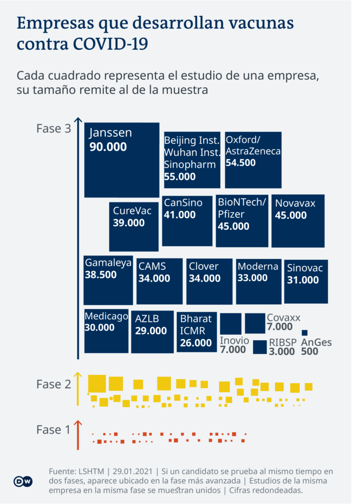 • La empresa belga Jannsen Pharmaceutical Companies está probando la eficacia de su candidato vacunal, que se basa en un vector viral no replicativo, en alrededor de 90.000 personas en Estados Unidos, Argentina, Brasil, Colombia y Bélgica.