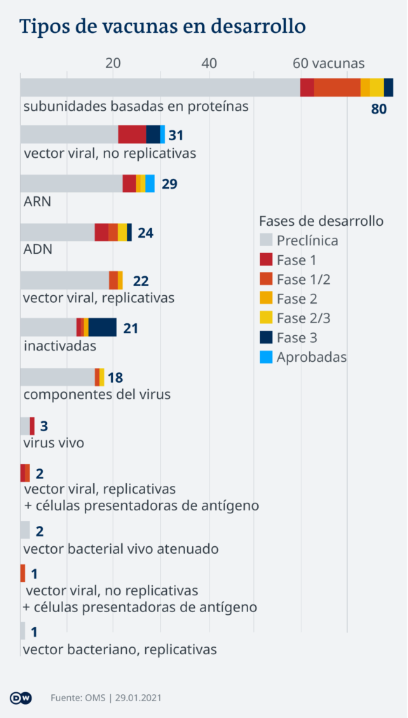 Los científicos prueban actualmente la eficacia de más de 50 candidatos vacunales en ensayos clínicos. Tres de las vacunas candidatas ya fueron aprobadas para uso de emergencia por la Administración de Alimentos y Medicamentos (FDA) de Estados Unidos.
